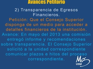 El documento resume los avances de cuatro peticiones presentadas al Consejo Superior. Una comisión está analizando un modelo de costos e ingresos y presentará avances. Otra comisión recomendó medidas de transparencia financiera. El Consejo Superior solicitó estudiar el impacto de matrículas diferenciadas. Se aprobó un segundo representante estudiantil en el Consejo, electo por federaciones.