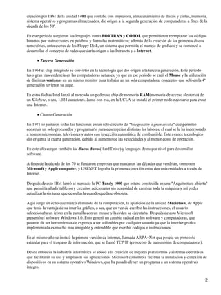 El documento resume la historia de las computadoras desde las primeras máquinas como la EDVAC y ENIAC de la primera generación hasta las computadoras modernas. Explica los avances tecnológicos clave como los transistores, circuitos integrados y chips que permitieron reducir el tamaño de las máquinas y aumentar su poder de procesamiento a lo largo de las generaciones. También destaca el desarrollo de lenguajes de programación, discos, mouse, ventanas e Internet que hicieron que las computadoras sean más accesibles para los usuarios
