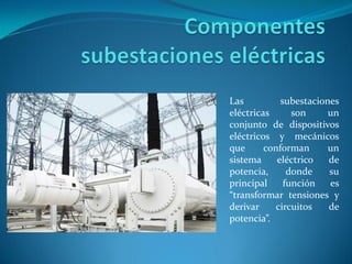 Las subestaciones eléctricas transforman tensiones y derivan circuitos de potencia mediante transformadores que ajustan voltajes y corrientes para transportar y distribuir energía eléctrica. Existen diferentes tipos de subestaciones según su función y construcción, como elevadoras, reductoras, de maniobra, intemperie e interiores, cada una adaptada a condiciones específicas. Además, la automatización y control remoto han mejorado la operación y gestión de las subestaciones, permitiendo un manejo más eficiente y reduciendo la necesidad de desplazamiento físico del personal.