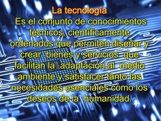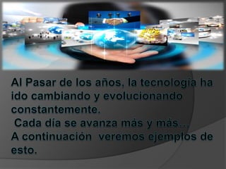El documento resume cómo la tecnología ha evolucionado para satisfacer las necesidades y deseos humanos. Explica que la tecnología se refiere a los conocimientos técnicos y científicos que permiten crear bienes y servicios para adaptarse al medio ambiente. Luego describe cómo los dispositivos como la televisión, el internet, los celulares, las tabletas y más recientemente los relojes inteligentes y gafas de realidad aumentada han pasado a ser fuentes primarias de entretenimiento, comunicación y productividad. Finalmente, menc