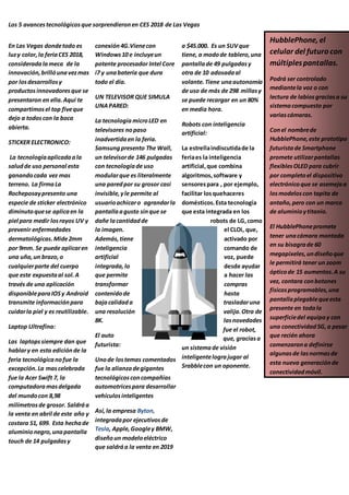 El documento resume los 5 avances tecnológicos más sorprendentes presentados en la feria CES 2018 de Las Vegas: 1) Un pequeño sticker electrónico que mide los rayos UV en la piel para prevenir enfermedades dermatológicas, 2) La laptop más delgada del mundo con apenas 8,98 milímetros de grosor, 3) Un televisor modular de Samsung de 146 pulgadas que simula una pared delgada, 4) Un SUV eléctrico diseñado por la alianza de empresas tecnológicas y automotrices que saldrá