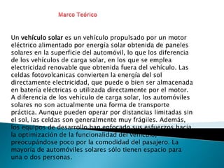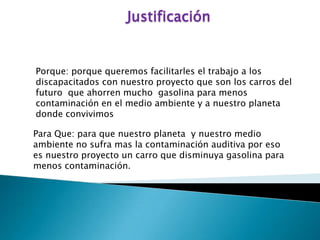 El documento justifica un proyecto de vehículos que ahorren gasolina y contaminen menos el medio ambiente y planeta para beneficiar a las personas con discapacidad y reducir la contaminación auditiva. Explica que un vehículo solar obtiene energía de paneles solares para impulsar un motor eléctrico, pero que actualmente no son prácticos para transporte debido a la fragilidad de las celdas y enfoque en funcionalidad sobre comodidad, llevando solo uno o dos pasajeros. Los objetivos del proyecto son dar a conoc