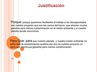 El documento describe un vehículo solar propulsado por energía solar que ayudaría a reducir la contaminación. Discuten que los vehículos solares actualmente no son prácticos para transporte debido a que las celdas son frágiles y tienen poco espacio para pasajeros. El objetivo general del proyecto es investigar mecanismos para reducir la contaminación ambiental.