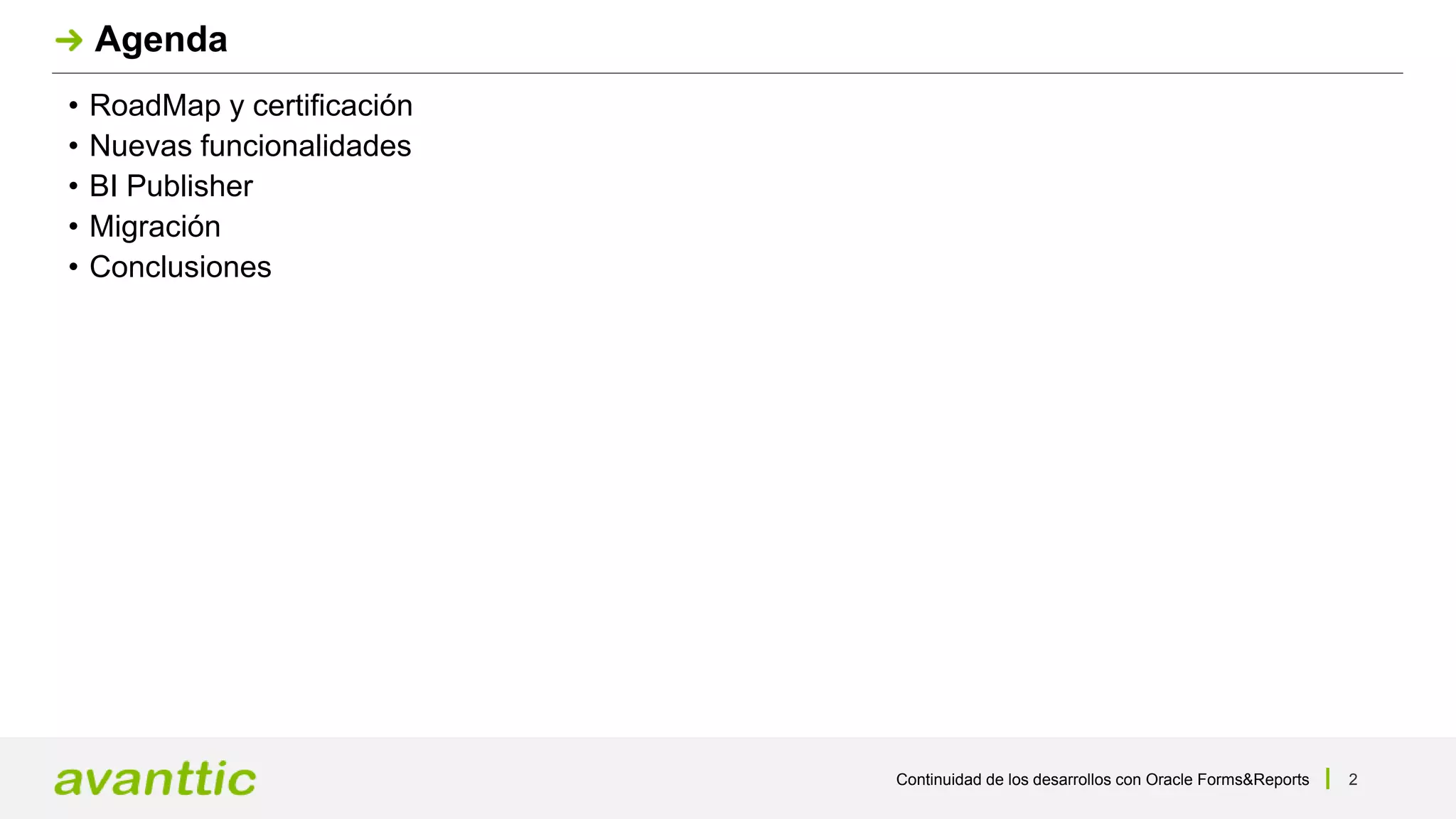 El documento discute la continuidad de los desarrollos con Oracle Forms y Reports, destacando la importancia de actualizar versiones y adoptar nuevas funcionalidades como BI Publisher. Además, se menciona la necesidad de migrar aplicaciones y se presentan herramientas como Avanttic Migrador para facilitar este proceso. Por último, se concluye que hay múltiples oportunidades de modernización y se aclara que Oracle Reports ha sido descontinuado, ofreciendo BI Publisher como alternativa.