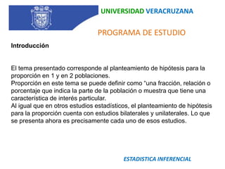 El documento presenta los conceptos básicos de planteamiento de hipótesis para la proporción en 1 y 2 poblaciones. Explica los contrastes bilaterales y unilaterales, así como las fórmulas y reglas de decisión utilizadas. Proporciona ejemplos numéricos para ilustrar cómo aplicar los métodos estadísticos inferenciales a datos reales sobre encuestas de opinión y calidad de productos.