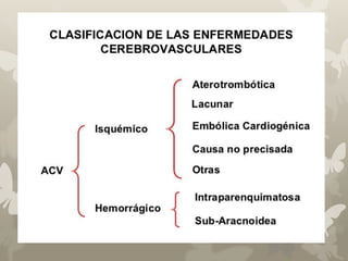 El documento detalla el accidente cerebrovascular (ACV), abarcando su etiología, clasificación y manifestaciones clínicas, así como pruebas diagnósticas y tratamientos. Se destaca la importancia de la prevención primaria y secundaria, así como el diagnóstico y manejo de hemorragias y isquemias cerebrales. Además, se mencionan los factores de riesgo y las tasas de mortalidad asociadas a este tipo de eventos vasculares.