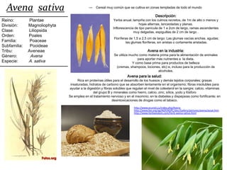 La avena sativa es un cereal común cultivado en zonas templadas que se utiliza principalmente como alimento para animales y base para productos de belleza e industriales. Es rica en nutrientes como proteínas, grasas insaturadas, hidratos de carbono, fibras y vitaminas que la convierten en un alimento saludable para tratar problemas nerviosos, insomnio, diabetes y desintoxicaciones.