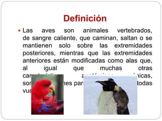 Este documento define las aves y describe sus características generales como su plumaje, esqueleto ligero, sangre caliente y reproducción ovípara. Explica que sus extremidades anteriores son alas que usan para volar y que su alimentación puede ser insectívora, herbívora, carnívora u omnívora dependiendo de la especie. Además, describe su comportamiento diurno y algunas capacidades cognitivas.