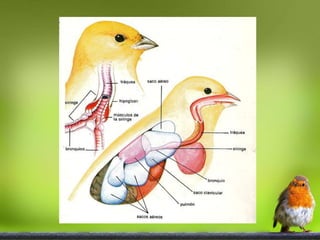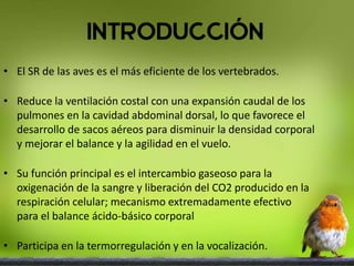 El sistema respiratorio de las aves es el más eficiente de los vertebrados. Utiliza sacos aéreos para reducir la densidad corporal y mejorar el vuelo. El aire entra por las fosas nasales y pasa por la laringe, tráquea, bronquios y sacos aéreos, donde ocurre el intercambio gaseoso de forma continua en ambas fases del ciclo respiratorio.