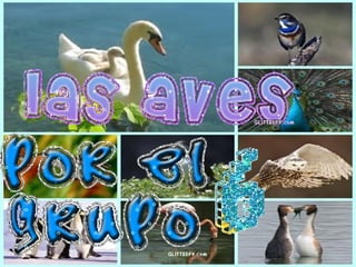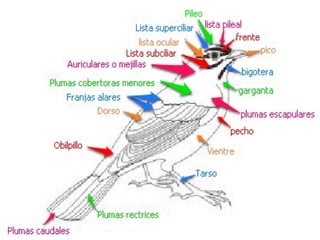 Este documento proporciona información sobre las aves, incluyendo sus características físicas como plumaje, picos y patas; su alimentación, vuelo, migración y adaptación a condiciones extremas; su canto, cortejo, nidos y huevos/polluelos; y aves domesticadas y amenazadas. Cubre temas como el origen de las aves, aves primitivas como el Archeopteryx, y detalla las partes anatómicas y funciones clave de las aves.