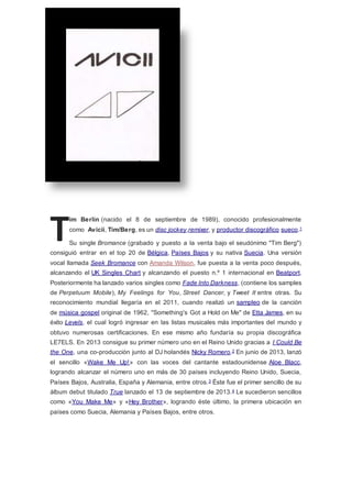 Avicii es un DJ y productor musical sueco que alcanzó fama internacional en 2011 con su éxito "Levels", el cual sampleó la canción gospel de 1962 "Something's Got a Hold on Me" de Etta James. En 2013, su sencillo "Wake Me Up!" con Aloe Blacc llegó al número uno en más de 30 países, y fue el primer sencillo de su álbum debut "True". Avicii ha lanzado varios éxitos más como "I Could Be the One", "You Make Me", y "Hey Brother".