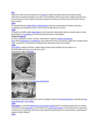 El documento detalla la evolución de la aviación desde mitos antiguos como el de Ícaro hasta experimentos y logros significativos en los siglos XVIII y XIX, incluyendo el uso de globos de aire caliente y el desarrollo de los primeros aviones. Se menciona a inventores clave como los hermanos Montgolfier y Otto Lilienthal, así como avances técnicos en vuelos con máquinas más pesadas que el aire. La información culmina en el siglo XX, resaltando el vuelo del primer dirigible de Zeppelin y otros hitos importantes de la aviación.