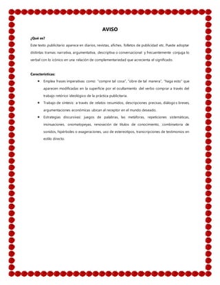 Este documento describe las características del texto publicitario. Su objetivo principal es la venta de productos y servicios mediante la apelación al receptor y la difusión de valores e ideologías. Los textos publicitarios informan sobre lo que se vende para hacer surgir en el receptor el deseo de comprar y solo presentan lo positivo del producto. Se construyen en torno a la función apelativa del lenguaje para modificar comportamientos y manipular el lenguaje con el fin de obtener el efecto deseado en el receptor.