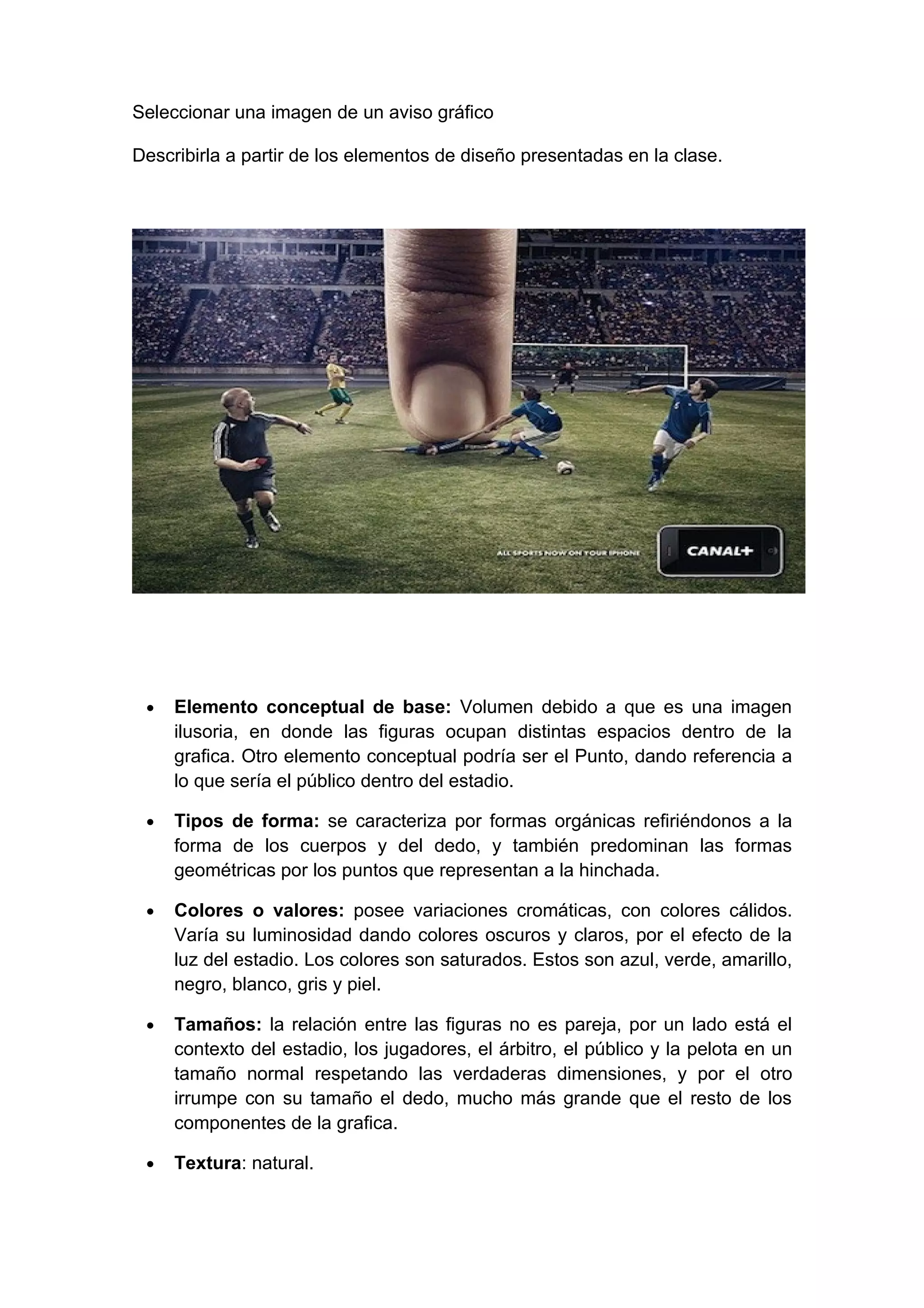 El documento describe los elementos de diseño presentes en una imagen de un aviso gráfico que representa un jugador de fútbol siendo aplastado por un dedo gigante. Los elementos clave incluyen formas orgánicas y geométricas, variaciones cromáticas con colores cálidos, tamaños desproporcionados entre las figuras, textura natural, posición centrada y significado alusivo a la pantalla táctil de un celular.