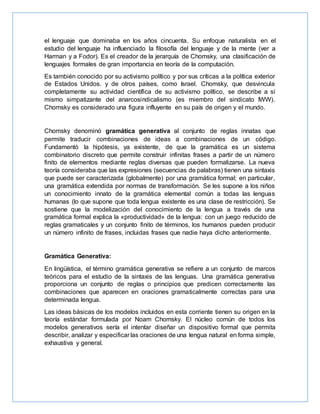 Avram Noam Chomsky es un lingüista, filósofo y activista estadounidense. Es conocido por proponer la gramática generativa, que situó la sintaxis en el centro de la investigación lingüística. También destaca por su crítica al conductismo y por establecer las bases de las ciencias cognitivas. Chomsky es una figura influyente tanto en lingüística como en política, donde critica la política exterior de Estados Unidos.