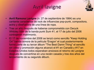 Avril Lavigne es una cantante y compositora canadiense de rock pop-punk. Tras casarse en 2006, lanzó su sencillo "Keep Holding On" que alcanzó el número 1 en Canadá y 17 en EE.UU. Además de su carrera musical, Lavigne también ha participado en películas prestando su voz y actuando.