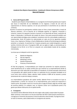 El programa Academia para Mujeres Emprendedoras ofrece un curso gratuito de 13 sesiones para 20 mujeres en 5 ciudades del Perú, con el objetivo de desarrollar sus habilidades empresariales. Las áreas cubiertas incluyen modelo de negocios, plan de negocios, marketing, gestión y finanzas. Las 3 emprendedoras por ciudad con los mejores proyectos recibirán capital semilla. El programa es promovido por la Embajada de EE.UU. en colaboración con universidades locales.
