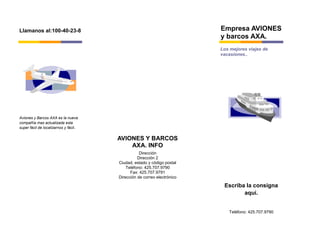 Aviones y Barcos AXA es una nueva compañía de viajes que ofrece vuelos y cruceros. Proporciona información de contacto como su dirección, teléfono y correo electrónico.