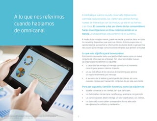 El documento describe cómo las empresas pueden crear una estrategia omnicanal exitosa aprovechando la capacidad de recolectar y analizar datos a través de múltiples canales y dispositivos. Explica que esto permite entregar comunicaciones personalizadas y generar mayor lealtad de los clientes. Sin embargo, también plantea desafíos como convencer a los clientes de compartir datos, analizarlos correctamente y proteger la privacidad. Finalmente, enfatiza que la experiencia del usuario es fundamental para el éxito de una estrategia omnicanal.