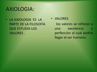 Este documento resume conceptos clave de la axiología. Explica que la axiología estudia los valores y define valores como excelencias humanas. Describe cuatro clases de valores: valores infrahumanos, valores humanos inframorales, valores instrumentales y valores terminales. También define las cuatro virtudes humanas fundamentales: prudencia, justicia, templanza y fortaleza. Por último, explica los conceptos de anomia, su origen como falta de normas sociales y algunas acciones para combatirla como la responsabilidad social y la formación profesional.
