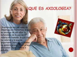 La axiología estudia la naturaleza de los valores humanos y lo que es importante para las personas. Existen valores humanos, infrahumanos, inframorales y morales. La anomia se refiere a la ausencia de normas y puede causar problemas en una sociedad. Para combatir la anomia, se debe generar responsabilidad social y conciencia a través de la educación.