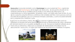 Ayacucho es una ciudad del Perú conocida como la "Ciudad de las Iglesias" debido a sus numerosos templos coloniales. La ciudad se encuentra situada a 2746 metros sobre el nivel del mar en la cordillera de los Andes y se caracteriza por su clima templado y seco. Es un importante centro de artesanía, cultura y tradiciones, con más de 30 iglesias que albergan obras de arte y festividades como la Semana Santa que atraen a visitantes todo el año.