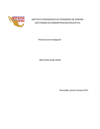 Este documento presenta un protocolo de investigación sobre el liderazgo directivo en la gestión escolar de los Jardines de Niños en Hermosillo, Sonora. En primer lugar, se presentan los antecedentes de la educación preescolar a nivel mundial y en México. Luego, se justifica la necesidad de investigar el papel de las directoras y cómo influyen sus estilos de liderazgo en la gestión escolar. Finalmente, se plantean las preguntas de investigación, la hipótesis, los objetivos y el plan metodológico de