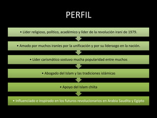 El ayatolá Jomeini fue un líder religioso y político iraní que dirigió la Revolución Iraní de 1979 que derrocó al Sha Mohammad Reza Pahlevi. Se opuso firmemente a la occidentalización y modernización impulsada por el Sha, especialmente a la reforma agraria que expropiaba tierras del clero chiíta. Fue exiliado de Irán en 1964 debido a su oposición, pero continuó su lucha desde el exilio. En 1979 regresó a Irán triunfante tras la revolución y as