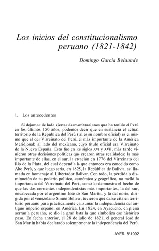 Este documento describe los inicios del constitucionalismo peruano entre 1821 y 1842. Durante este periodo, el Perú tuvo cinco constituciones pero ninguna tuvo vigencia completa debido a la inestabilidad política y el caudillaje anárquico. Fue una época de transición donde aún no se había definido plenamente la nacionalidad peruana.