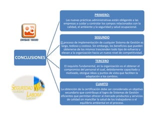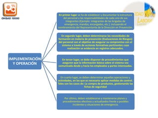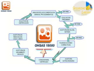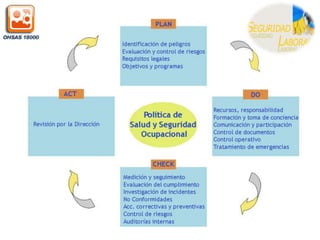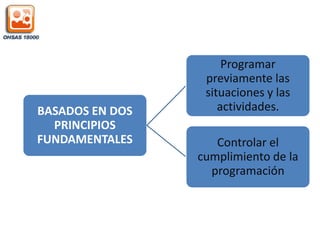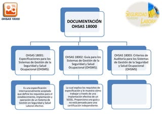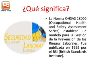 Este documento describe la Norma OHSAS 18000, la cual establece un modelo para la gestión de la prevención de riesgos laborales. Se basa en el ciclo Planificar-Hacer-Comprobar-Ajustar para la implementación de Sistemas de Gestión de la Seguridad y Salud Ocupacional. Incluye elementos como una política de prevención de riesgos, la identificación y evaluación de peligros, objetivos de mejora, verificación y acción correctiva, y revisión por la dirección para asegurar la idoneidad del sistema. La
