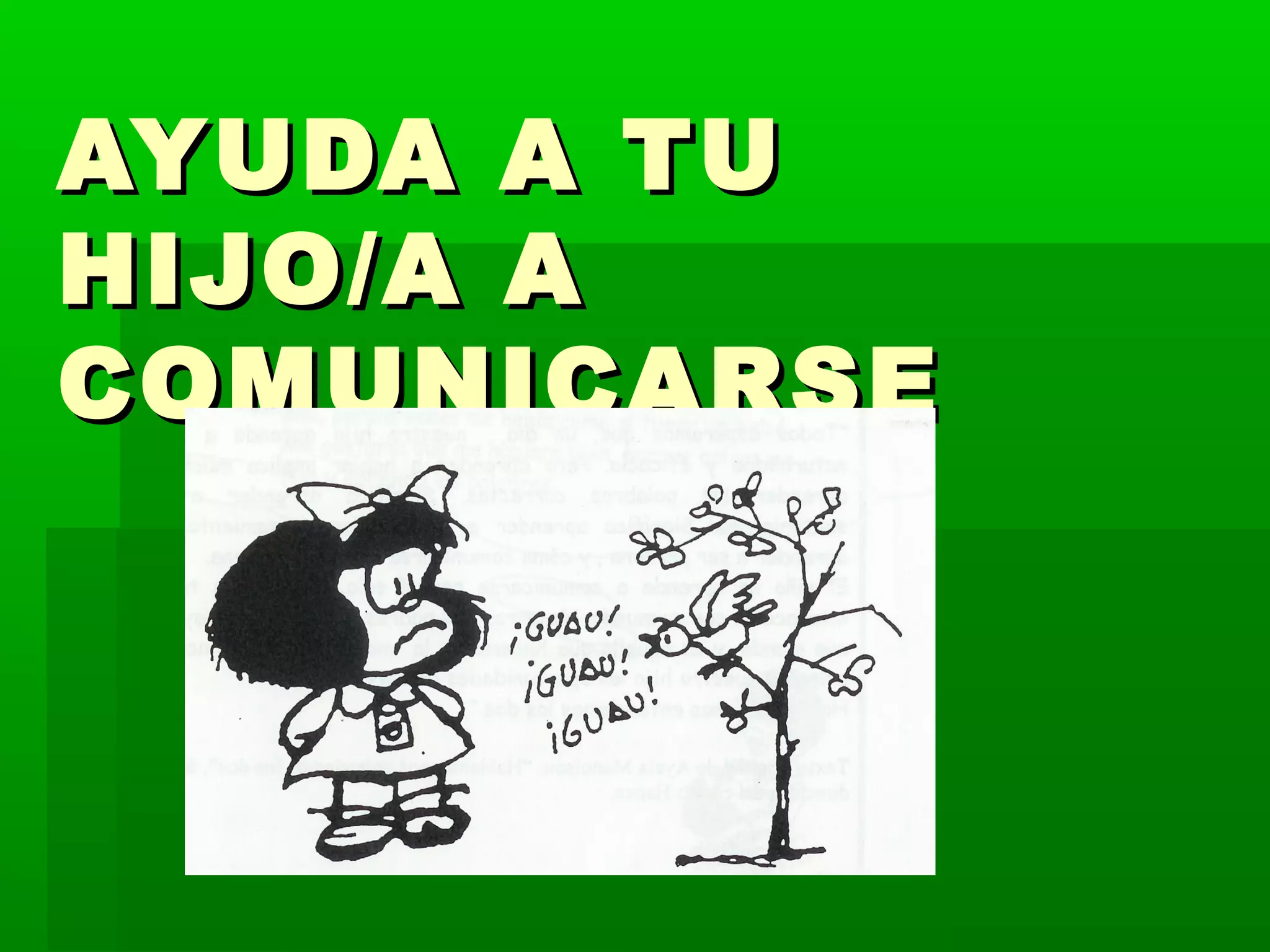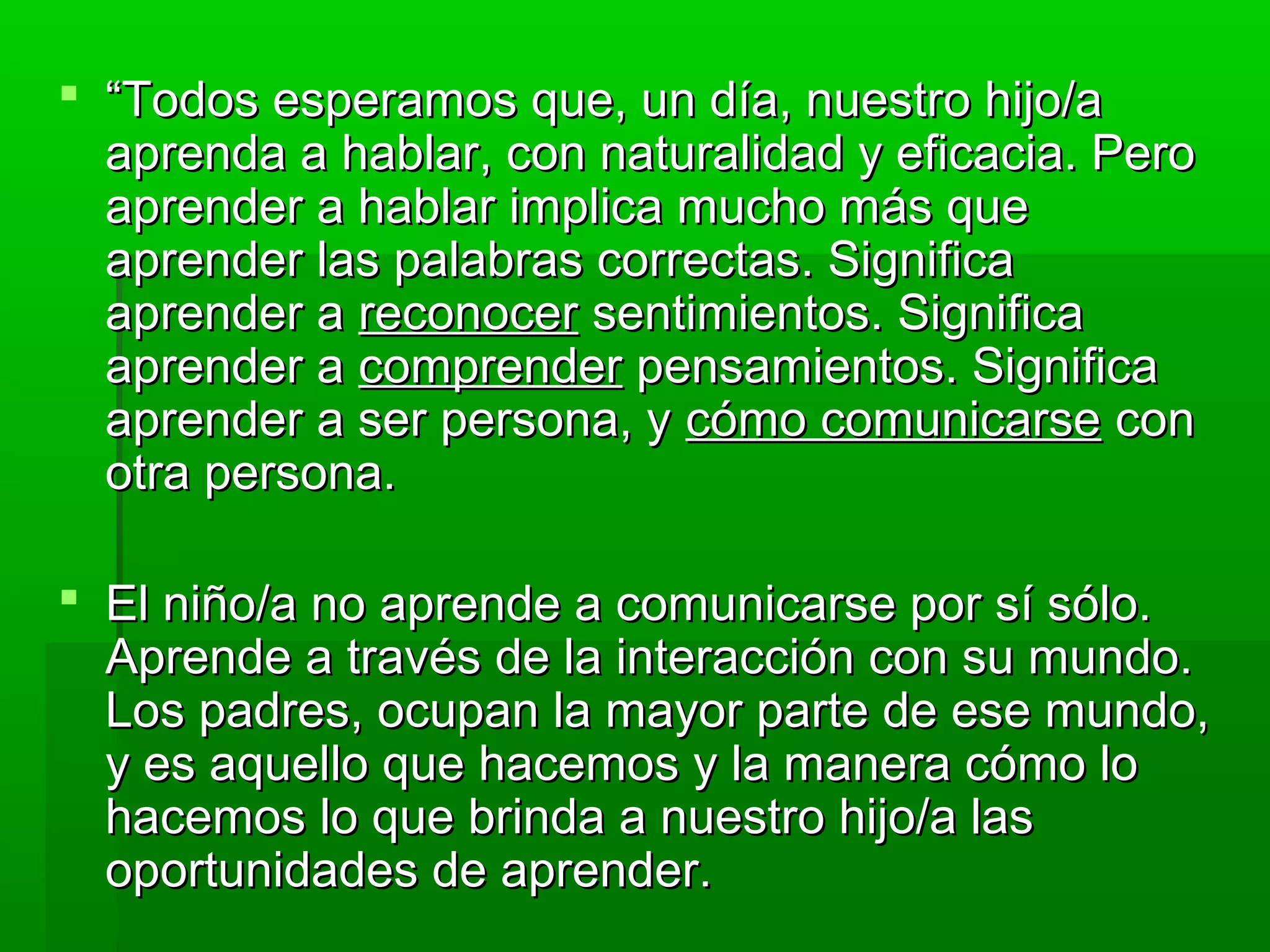 Este documento ofrece consejos para ayudar a los niños a desarrollar su capacidad de comunicación y lenguaje. Recomienda que los padres hablen correctamente con los niños, escuchen con atención, y proporcionen oportunidades para que los niños aprendan mediante la imitación y la interacción. También enfatiza la importancia de dedicar tiempo de calidad a los niños y crear un ambiente de apoyo para que se sientan cómodos expresándose.