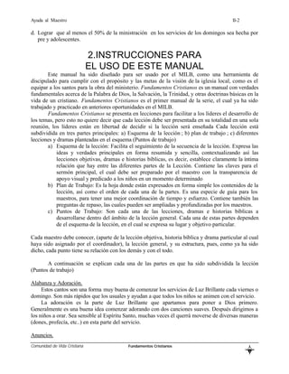 Este documento presenta las instrucciones para el uso del manual "Ayuda al Maestro" por el Ministerio Infantil de la iglesia. 1) Define la visión del MILB de entrenar y preparar a los niños para el ministerio. 2) Explica que el manual está dividido en lecciones que cubren doctrinas cristianas fundamentales. 3) Detalla las partes de cada servicio del MILB como alabanza, ofrenda, y enseñanza de la lección a través de varios métodos.