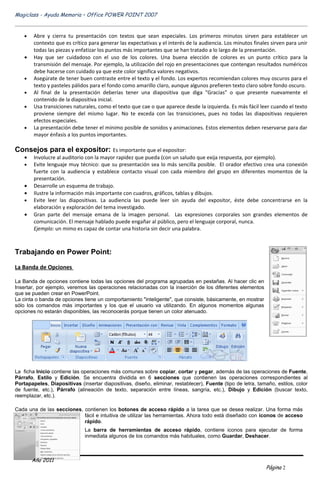 Este documento proporciona una guía de referencia sobre las funciones y herramientas de Microsoft PowerPoint 2007. Explica que PowerPoint permite crear presentaciones visuales y atractivas para comunicar información a un público de manera efectiva. Detalla las diversas herramientas que ofrece para diseñar diapositivas de alta calidad e insertar objetos multimedia. Además, brinda consejos sobre cómo planificar y dar una presentación exitosa.