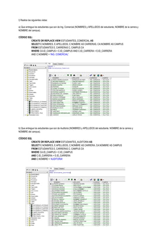 Este documento presenta el código SQL para crear diferentes vistas sobre una base de datos de una biblioteca universitaria. Las vistas incluyen información sobre estudiantes de diferentes carreras y campus, estudiantes con libros atrasados, libros de editoriales extranjeras, libros en reserva, y estadísticas sobre préstamos y estudiantes. El código SQL utiliza tablas como estudiantes, libros, autores, editoriales, y préstamos para generar las vistas requeridas.