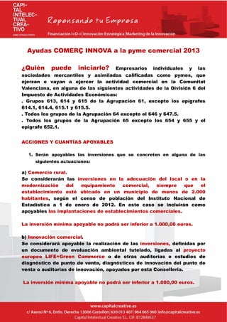 Este documento describe las ayudas COMERÇ INNOVA a la pyme comercial 2013 en la Comunitat Valenciana. Estas ayudas apoyan inversiones para la modernización y mejora de establecimientos comerciales, como la adecuación de locales, equipamiento, innovación comercial y comercio rural. Las pymes individuales y sociedades mercantiles calificadas como pymes pueden solicitar estas ayudas, que cubren hasta un 45% del gasto total y tienen un límite de 15.000 euros o 3.000 euros según el tipo de inversión. El pl