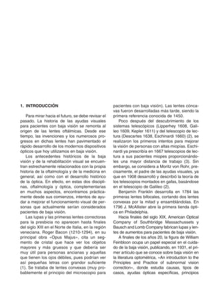 El documento detalla la evolución de las ayudas visuales para personas con baja visión desde sus inicios hasta la actualidad, destacando hitos históricos como la invención de lentes y telescopios. Se discuten las diferentes clasificaciones y tipos de ayudas visuales, así como su importancia en la rehabilitación funcional de pacientes con hipovisión. Asimismo, se enfatiza la necesidad de un enfoque personalizado en el tratamiento y uso de estas ayudas para mejorar la calidad de vida de los pacientes.