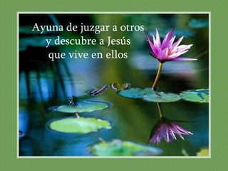 El documento propone ayunar de actitudes y pensamientos negativos como juzgar a otros, usar palabras hirientes, descontento, enojo y pesimismo durante la Cuaresma, y en su lugar llenarse de actitudes positivas como gratitud, mansedumbre, esperanza, confianza en Dios, alegría y amor hacia los demás para acercarse más a Jesús.