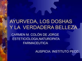 El documento explora el Ayurveda, una antigua ciencia india que abarca curación física, psicológica y espiritual, centrándose en la interacción entre el espíritu y la materia. Describe los tres doshas —vata, pitta y kapha— que representan diferentes constituciones humanas y sus características, contribuciones al bienestar y a la salud. Además, aborda la relación entre la verdadera belleza y la armonía interna, resaltando la importancia de la salud integral para alcanzar un estado natural de belleza.