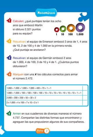 Este documento presenta varios problemas matemáticos relacionados con la compra y venta de pochoclos. Uno involucra el cálculo de vuelto recibido al pagar $50 por 3 envases medianos y 2 grandes. Otro pide calcular la cantidad total de envases pequeños comprados por 4 hermanitos y si $30 alcanzó para eso.