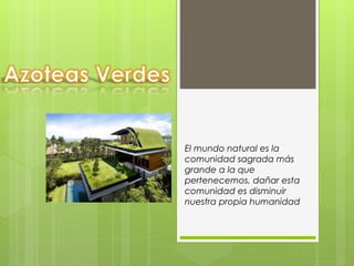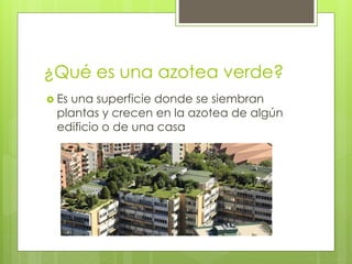 El documento describe los beneficios de las azoteas verdes, incluyendo la reducción de temperaturas, mejora de la calidad del aire, aumento del valor de la propiedad y captura de gases contaminantes. Explica tres tipos principales de azoteas verdes (extensiva, semi-intensiva e intensiva) que varían en la vegetación permitida y el mantenimiento requerido. Resalta que las azoteas verdes ayudan a combatir el cambio climático y recuperar recursos naturales.