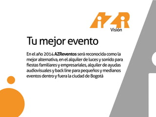 AZReventos ofrece alquiler de luces y sonido, back line, y ayudas audiovisuales para eventos familiares y empresariales. Su visión es ser reconocida como la mejor alternativa en Bogotá para estos servicios. Su objetivo es desarrollar eventos familiares y empresariales con alta recordación musical y mezclas a través de puntualidad, cumplimiento y servicios a la medida de cada necesidad.