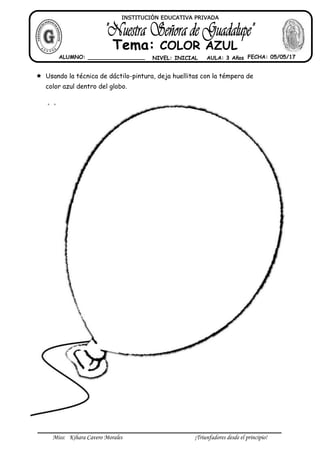 La alumna usó la técnica de dáctilo-pintura para dejar huellas con pintura azul dentro de un globo, como una actividad en el nivel inicial sobre el tema del color azul.