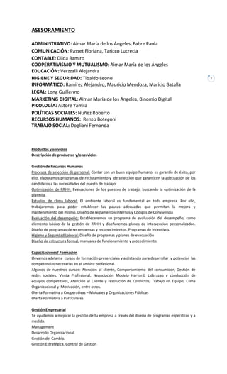 Nuestro grupo de profesionales ofrece asesoramiento y capacitación integral a empresas y organizaciones en diversas áreas, incluyendo legal, contable y marketing. Buscamos ser reconocidos por la alta calidad de nuestros servicios y por maximizar el potencial organizacional de nuestros clientes. Además, brindamos cursos de formación y desarrollamos programas específicos para mejorar la gestión empresarial y la comunicación.