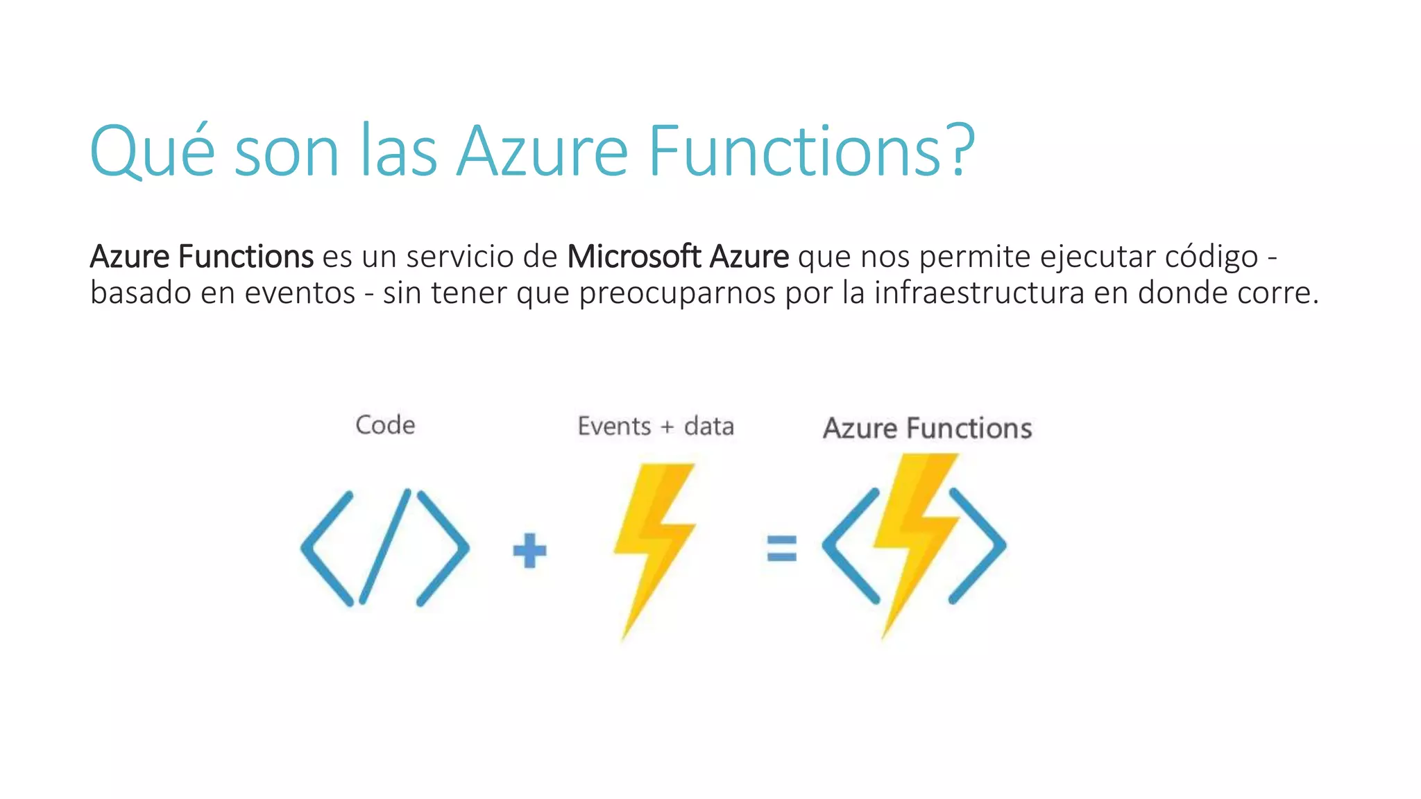 Azure Functions es un servicio de Microsoft Azure que permite ejecutar código basado en eventos sin preocuparse por la infraestructura subyacente. Ofrece una experiencia serverless que permite escalar nanoservicios según la demanda a través de disparadores como Blob, cola o webhook. Soporta varios lenguajes como C#, JavaScript, Python y PHP.