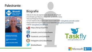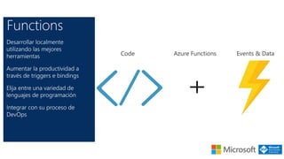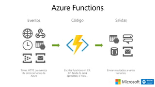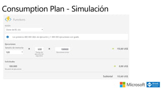Carlos dos Santos es un experto en desarrollo de software con más de 25 años de experiencia. Es un Microsoft MVP y Regional Director que ha creado proyectos de código abierto populares. La presentación trata sobre Serverless computing y Azure Functions, incluyendo los beneficios de Serverless como escalabilidad, facturación por uso y abstracción de servidores. Se demuestra una función de Azure y se discuten temas como planes de consumo y planes de servicio de aplicaciones.