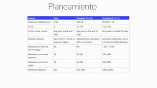 El documento detalla la gestión, despliegue y monitoreo de bases de datos en Azure SQL, incluyendo servicios de migración de datos y control de acceso a través de firewalls y logins. Se describen herramientas como Azure Data Factory y SQL Server Integration Services, así como la importancia de la auditoría y el monitoreo del rendimiento. También se mencionan características como geo-replicación y restauración de datos para asegurar alta disponibilidad y recuperación ante desastres.