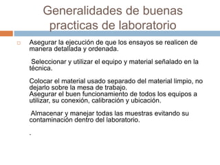 Este documento presenta las buenas prácticas de laboratorio que deben seguirse para asegurar resultados precisos y evitar contaminaciones. Entre ellas se incluyen asegurar el buen funcionamiento de los equipos, almacenar y manejar muestras evitando su contaminación, emplear técnicas analíticas correctamente, y asegurar el uso de implementos de seguridad como mandiles y guantes. También describe los diferentes métodos para sembrar muestras en placas, como la siembra incorporada o en superficie, y los cuidados requer