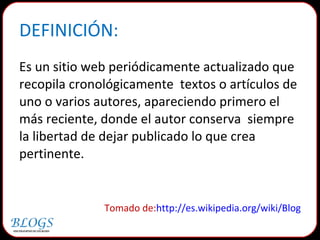 El documento describe las ventajas educativas de los blogs. Los blogs permiten a estudiantes y profesores compartir información y recursos educativos de manera instantánea. Esto fomenta la escritura, lectura y trabajo colaborativo entre estudiantes. Los profesores pueden comunicarse más fácilmente con estudiantes y padres, y compartir materiales y proyectos de clase. Existen herramientas gratuitas como Blogger que facilitan la creación y administración de blogs educativos.