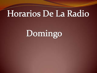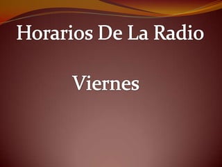 Este documento presenta la programación radial de lunes a jueves con los conductores de diferentes programas como "Bien Levantado", "Terapia Despareja", "Al Ataque" y "Código Sily". Los viernes y sábados incluyen los programas "Disco POP" y "Pop Dee Jay", y los conductores radiales para los días sábado y domingo.