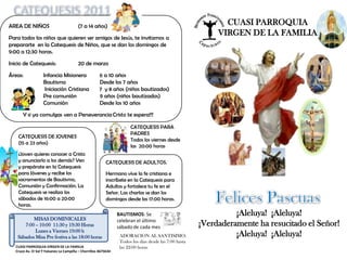 Este documento presenta la programación de catequesis para niños, jóvenes y adultos en la Cuasi Parroquia Virgen de la Familia, incluyendo las fechas de inicio, horarios y áreas temáticas. También proporciona información sobre misas dominicales y días de la semana, bautismos, adoración eucarística permanente y palabras del Párroco invitando a vivir los misterios de la Semana Santa y celebrar la resurrección de Cristo.